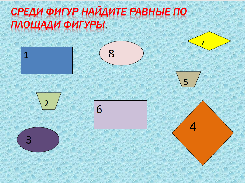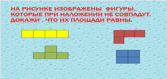 | II. Мотивация учебной деятельности учащихся. Цель: создать условия для монтировки активной, осознанной деятельности; Актуализация знаний. Формулировка темы занятия Цель: создание условий для активации опорных знаний. III.Формулировка темы и задач урока. Цель: создать условия для монтировки активной, осознанной деятельности; вовлечение учащихся в постановку задач занятия. IV.Обобщение и систематизация знаний Цель: создание условий для целостного обобщения знаний, А) подготовка к обобщённой деятельности, воспроизведение знаний на новом уровне V.Физминутка VI.Применение знаний в новой учебной ситуации Цель: создание условий для применения имеющихся знаний, умений в практической деятельности VII. Подведение итогов занятия. Цель: создание условий для упорядочивания и обобщения полученной информации VIII.Рефлексия. IХ. Информация о домашнем задании, инструктаж по его выполнению. Приложение | Математическая разминка - Найдите значение математических выражений, расположите буквы в соответствии с их значениями. - Какое слово получилось? (ФИГУРЫ) -Какие геометрические фигуры вы знаете? -Назовите свойства данных фигур. -Какая из них больше всего занимает места?(Прямоугольник) - Как определили?( на глаз) (Беру прямоугольник, прикладываю к доске, обвожу его мелом по контуру и убираю фигуру) - Что видите?(Прямоугольник на доске занял определенное место) - Предположите: как называется место, которое занимает фигура?(Ответы детей) Предположите, какова тема нашего урока? - Какие задачи урока поставим? -дать определение площади; -повтрить способы сравнения фигур; - упражняться в определении площадей фигур и их сравнении; Работать мы сегодня будем в парах. Правила работы помним. I.Чтобы ответить на поставленные вопросы обратимся к исследованию. (Каждая группа получает конверт с заданиями). Результаты наблюдений фиксируем в рабочем листе. -Не забудьте оценвать работу своей пары. -Какие геометрические фигуры лежат у вас на столах? -Что можно сказать о S прямоуг. по сравнению с другими фигурами?(больше по размеру- и S его больше). -Каким способом это определили? (На глаз.) -Назовите предметы в классе, которые имеют S.Сравните их по S с другими предметами. Вывод: 1 способ сравнения площадей предметов - «на глаз». II.Поработаем с кругом и квадратом. Можно ли «на глаз» сравнить их площади?(Нет) - Почему?(Это сделать трудно. Одна фигура с углами, у второй углы отсутствуют) - Найдите другой способ сравнения. (Наложить одну фигуру на другую) - Какой вывод можно сделать? Вывод: т.к. круг полностью поместился в квадрат, площадь квадрата больше площади круга, а соответственно площадь круга меньше площади. квадрата. 2 способ сравнения сравнения площадей - «метод наложения» III.Возьмите белые фигуры. Сравните. Можно ли «на глаз» сравнить их площади?(Нет). Почему?(Трудно это сделать) А наложением? (Нет) Почему? (Ответы детей) Проблема: как сравнить площади фигур, если «на глаз» и наложением одной на другую не получается? - Чтобы ответить на этот вопрос, переверните фигуры. Что вы видите? (Фигуры поделены на клетки – мерки). Мерка – значит мерить, измерять. Мерки могут быть представлены в иде различных геометрических фигур. - Что можете сказать о размерах клеток? (Они одинаковые) - Что можно сделать? (Посчитать количество клеток в каждой фигуре. Сравнить) Вывод: в 1 фигур е 13 клеток–мерок, а в фигур