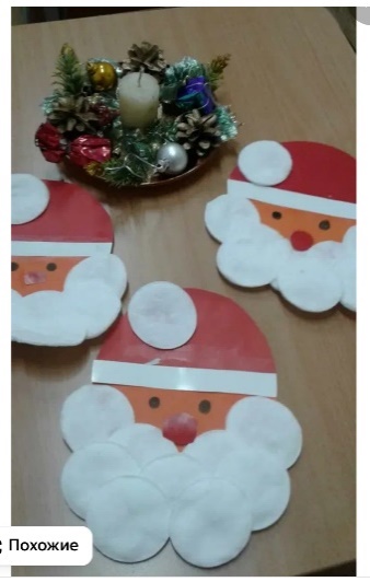 Раздать круг (шаблон). Попросить обвести его два раза на коричневом картоне и красном. Вырезать круги. Красный круг разрезать пополам - это шапка Дед Мороза. Коричневый- это лицо. Наклеить шапочку на верхнюю часть коричневого круга. Бороду сделать из ватных дисков. Вырезать из ватного диска маленький кружочек (можно скатать из ваты) - это помпончик на шапку. Приклеить нос, нарисовать глаза. Наша поделка готова.