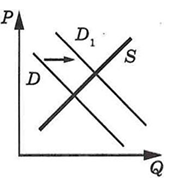 Спрос переместился из положения D в положение D1 при неизменном предложении S. (На графике P – цена товара; Q – количество товара.)