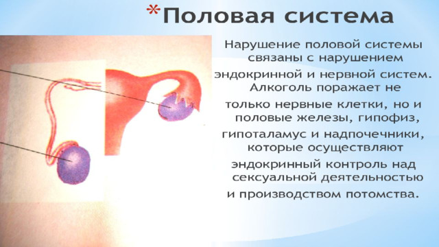 Алкоголь оказывает вредное влияние на железы внутренней секреции и в первую очередь на половые железы; снижение половой функции наблюдается у одной трети лиц , злоупотребляющих спиртными напитками.