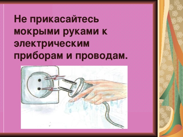 5. Не прикасайтесь к включённому электроприбору мокрыми руками. Помните! Нельзя пользоваться электрическими устройствами, находясь в воде.