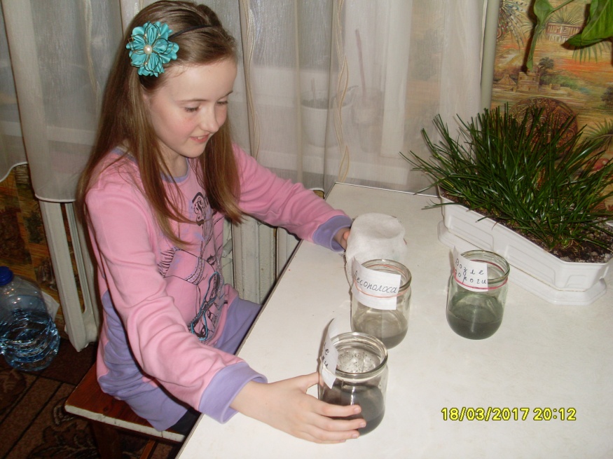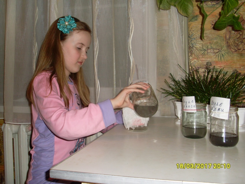 3.Фильтр после воды из сосуда, пробы которых взяты возле лесопосадки, был самым чистым. Отсутствие автодороги, промышленных предприятий, а также наличие естественного природного фильтра - деревьев, сыграло большую роль.
