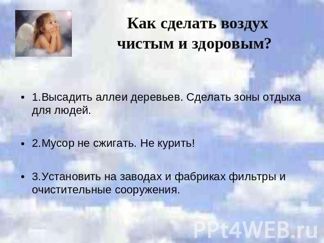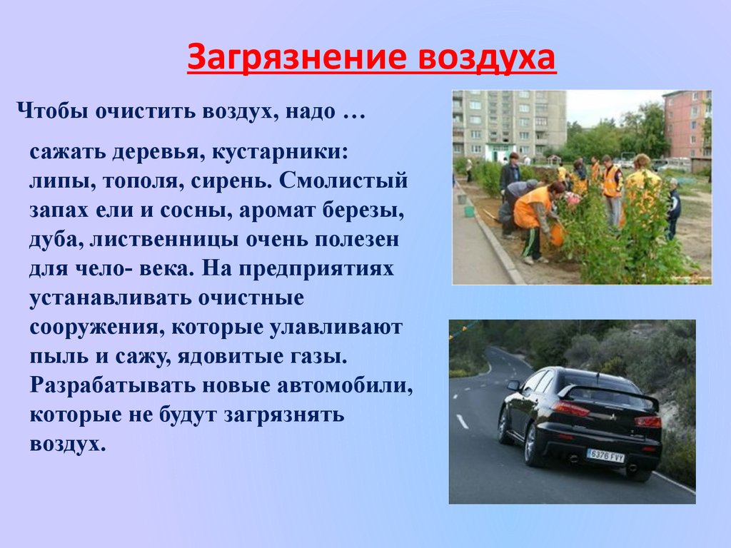 Много сделано и делается для охраны чистого воздуха, но этого мало. Нужно прежде всего начать с себя: «Что я сделала для того, чтобы воздух стал чище?»