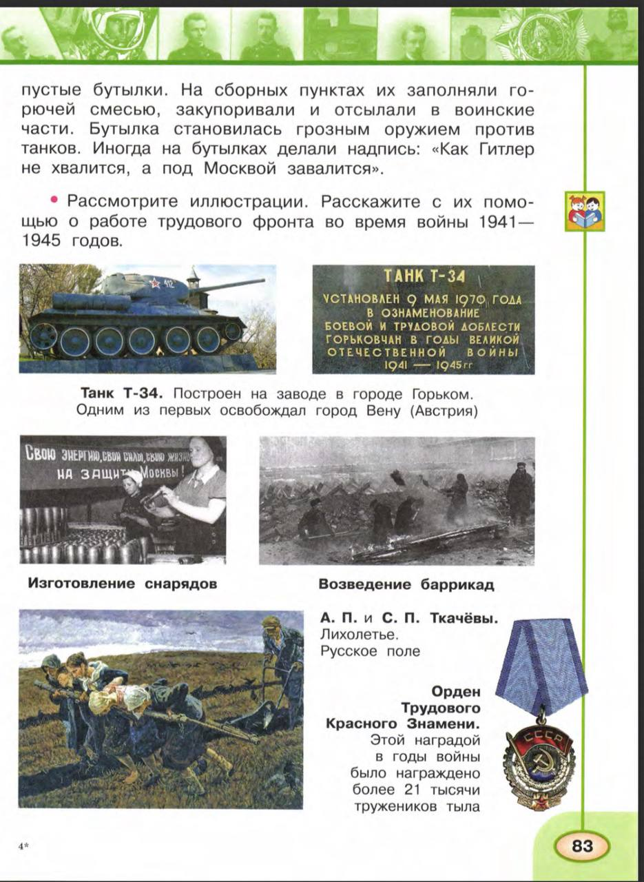 | 4. Работа по теме | - Сегодня на уроке мы поговорим о важной странице истории нашей страны – о трудовом фронте времён Великой Отечественной войны. Вы, конечно, знаете, что это была война, очень страшная и тяжёлая. Но помимо сражений на полях боя, шёл ещё один, не менее важный, фронт – трудовой. Представьте себе: мужчины ушли на войну, защищать Родину. А кто же будет работать в городах и сёлах? Кто будет производить оружие, одежду, еду для солдат и для всех остальных? Этот огромный труд лег на плечи женщин, детей, стариков. Они работали на заводах, в колхозах, в шахтах, строили дороги и мосты, лечили раненых. Это был невероятно тяжёлый труд, часто в голоде и холоде, под постоянными бомбёжками. - Героизм в тылу не уступал героизму на фронте. Люди работали круглосуточно, часто под открытым небом, в лютые морозы. Значительное количество оборудования располагалось в неприспособленных помещениях. Рабочие стремились дать больше продукции фронта. Как вы думаете почему? - Каждый выкованный снаряд, каждый выращенный колосок пшеницы приближали долгожданный день победы. - Ребята, приведите примеры. Что производили люди, работающие в сёлах и городах? - А кто, в основном, трудился в тылу, если почти все мужчины ушли на войну? - Где работали люди на трудовом фронте? - Что они делали? - Почему люди, работающие на трудовом фронте тоже считаются героями? - Чтобы лучше разбираться в этой теме, давайте прочитаем первые 2 абзаца на с. 82 учебника про себя. Даю пару минут. - Перечислите, кто шёл защищать Отечество? - Найдите и прочитайте, что делали с громадными станками? - В какие города перевозили предприятия? - Под каким девизом они начинали работать там? - Чем в этой войне стал тыл? - Чем необходимо было обеспечить войска, чтобы оборона была успешной? - Что для этого было необходимо? - Кто занял рабочие места мужчин? - Читаем следующие 2 абзаца на с. 82-83. Даю пару минут - Чем помогали подростки во время войны? - Какой вклад вносили дети? - Что делали школьники? Прочитайте в тексте. - Какую надпись делали на бутылках? | Слушают материал - Потому что понимали: от их труда зависела победа над врагом - Оружие, одежду, еду для солдат и всех остальных - Женщины, дети, старики - На заводах, в колхозах, в шахтах, больницах - Строили дороги и мосты, лечили раненых - Потому что они работали круглосуточно, и в мороз, и в жару, и под открытым небом без еды, воды. - Весь народ: юноши, взрослые люди, девушки и женщины. - Громадные тяжёлые станки разбирали, упаковывали, грузили на жд платформы, доставляли в пункт назначения, устанавливали на новом месте. - В Казань, Омск, Новосибирск - Всё для фронта, всё для победы! - Трудовым фронтом - Техникой, оружием, боеприпасами, одеждой, едой. - Необходимо было, чтобы бесперебойно работали железная дорога, морской и речной транспорт, все виды связи – телефон, телеграф, почта, радио. - Старики, женщины и подростки. - Они были организованы в строительные отряды, сдав экзамены, уезжали сооружать противотанковые рвы для защиты городов. - Ухаживали в госпиталях за ранеными, опекали малышей, пока сутками трудились для фронта матери. - Собирали бутылки. Заполняли их горючей смесью, закупоривали и отсылали в воинские части. Бутылка становилась грозным оружием против танков. - «Как Гитлер не хвалится, а под Москвой завалится.» | Познавательные: знаково-символические средства (логические 