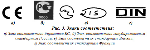 Знаки соответствия — это обозначения, которые наносятся на товар и (или) упаковку для подтверждения соответствия качества товара требованиям нормативных или технических документов. Знаки соответствия классифицируются на международные, региональные и национальные. Примером регионального знака соответствия может служить знак европейского экономического сообщества "СЕ" (рис. 3).
