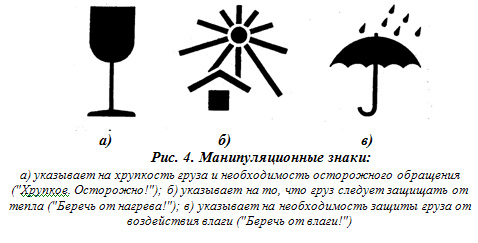 Манипуляционные знаки наносят в основном на транспортную тару или упаковку. Эти знаки дают указания по выполнению погрузочно-разгрузочных работ (рис. 4).