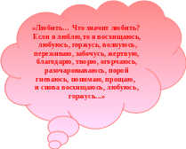 «Любить… Что значит любить? Если я люблю,то я восхищаюсь, любуюсь, горжусь, волнуюсь, переживаю, забочусь, жертвую, благодарю, творю, огорчаюсь, разочаровываюсь, порой гневаюсь, понимаю, прощаю, и снова восхищаюсь, любуюсь, горжусь.»
