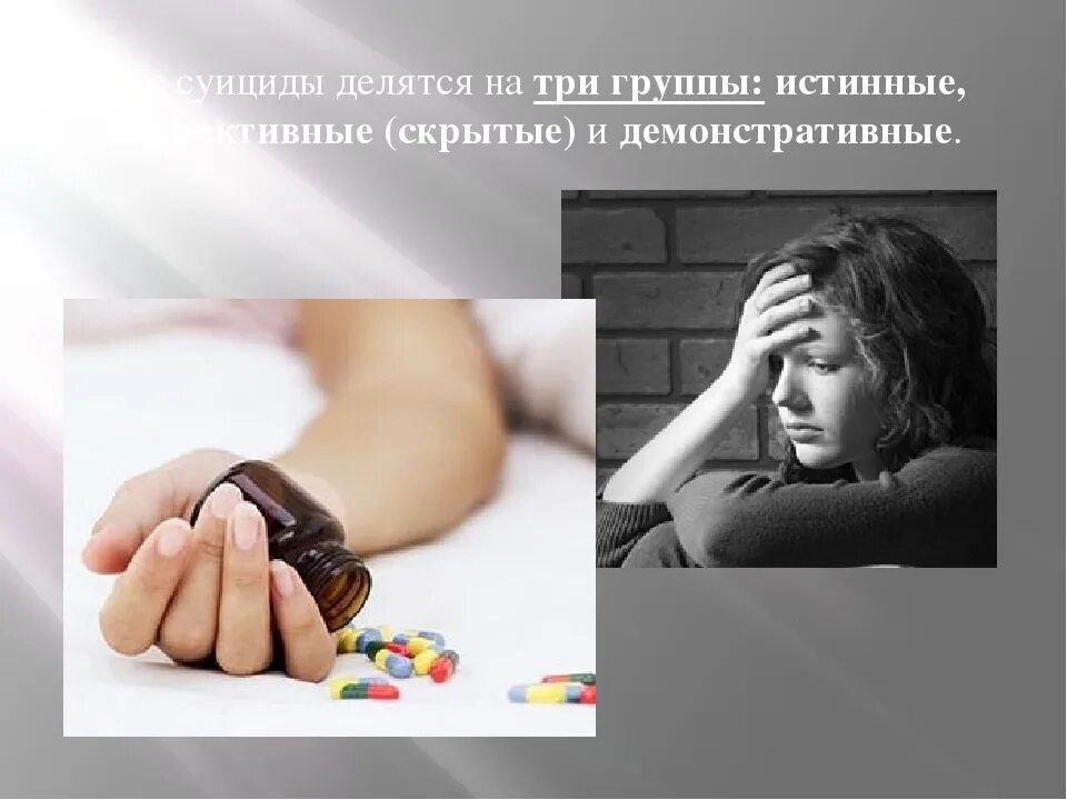 Демонстративный: попытка привлечь внимание, часто без реального намерения умереть.