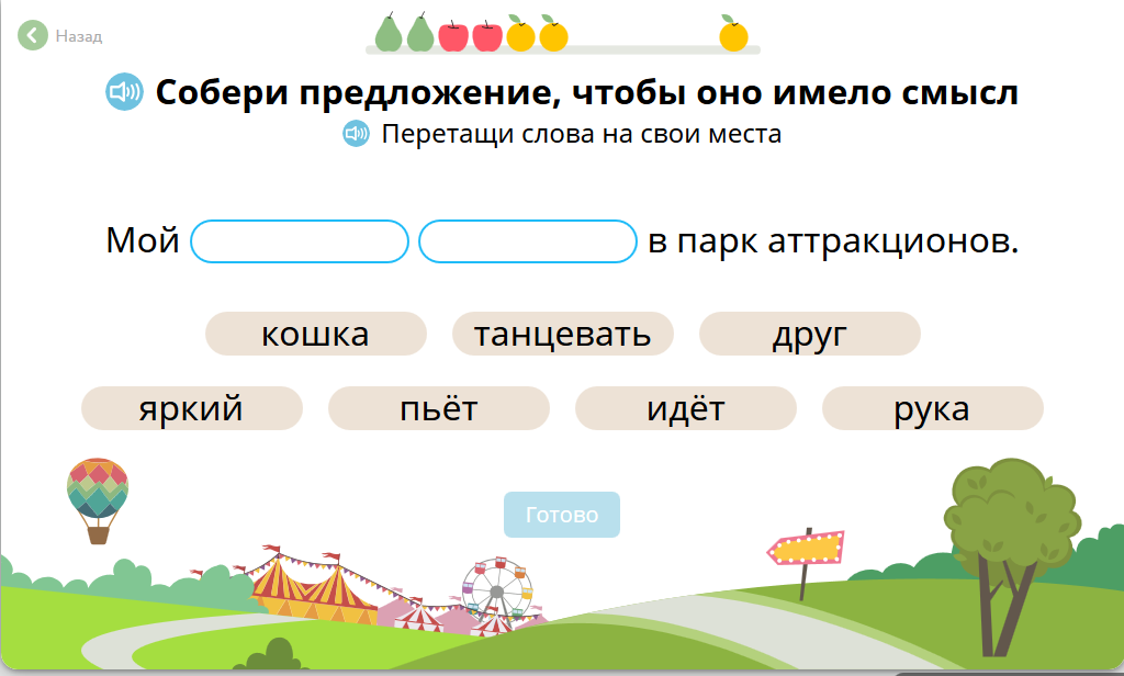 3.Дружный класс, дикие животные, свежие овощи, новое пальто, сладкая морковь, резиновые сапоги, огромный город, шёлковый платок, желтыйкарандаш, хитрая лисица.