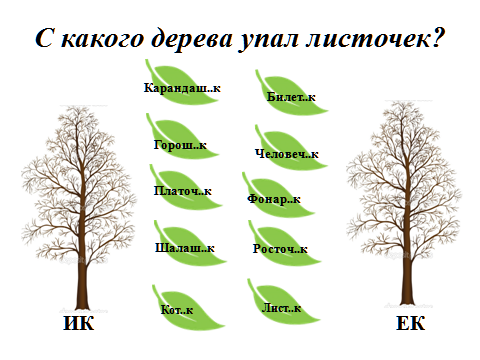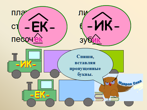 5.Первичное закрепление | Цель этапа Формирование умения выполнять задание по алгоритму: написание гласной в суффиксе ек или ик. Взаимодействие в образовательном процессе | -Для того, чтобы мы смогли писать слова с суффиксами –ик, -ек, я предлагаю вам составить алгоритм. Слайд 13. Выделяем корень слова. Если слышим после корня [ИК], сразу слово не пишем. Изменяем форму слова, подставляя к нему слова нет, много. Если гласный звук остался, пишем суффикс –ИК-, если гласный звук исчез, пишем суффикс –ЕК-. -Итак, мы ответили на все вопросы. А сейчас я предлагаю вам потренироваться. Дифференцированная работа. Работа парами - Слова надо записать в два столбика. В первый столбик будете записывать слова с суффиксом -ик, а во второй с суффиксом -ек. ) - Какой следующий шаг на уроке? Картинный диктант Работа в группе Соедините . Исправьте ошибки Молодцы, отлично справились. А нас ждет следующее задание… Будьте внимательны. Витя решил вас запутать. Перед вами слова. Но не все из них написаны верно. Вам нужно найти те слова, в которых есть ошибки, и записать верный вариант. После окончания этой работы, подводим итог: Когда в слове пишется суффикс –ик , а когда –ек –? | Составляют алгоритм. Работа в группе Проверка Закрасить грибок Платоч..к Стол..к Песоч..к Листоч..к Билет..к Зуб..к Работают над закреплением правила. Учатся работать по алгоритму. Записывают в тетрадь Слова Закрасьте грибок Работа по карточкам Работа парами Закрасьте грибок Работа в группе Оценка Раскрасьте грибок | Решают типовое задание на новый способ действия с проговариванием алгоритма во внешней речи. |