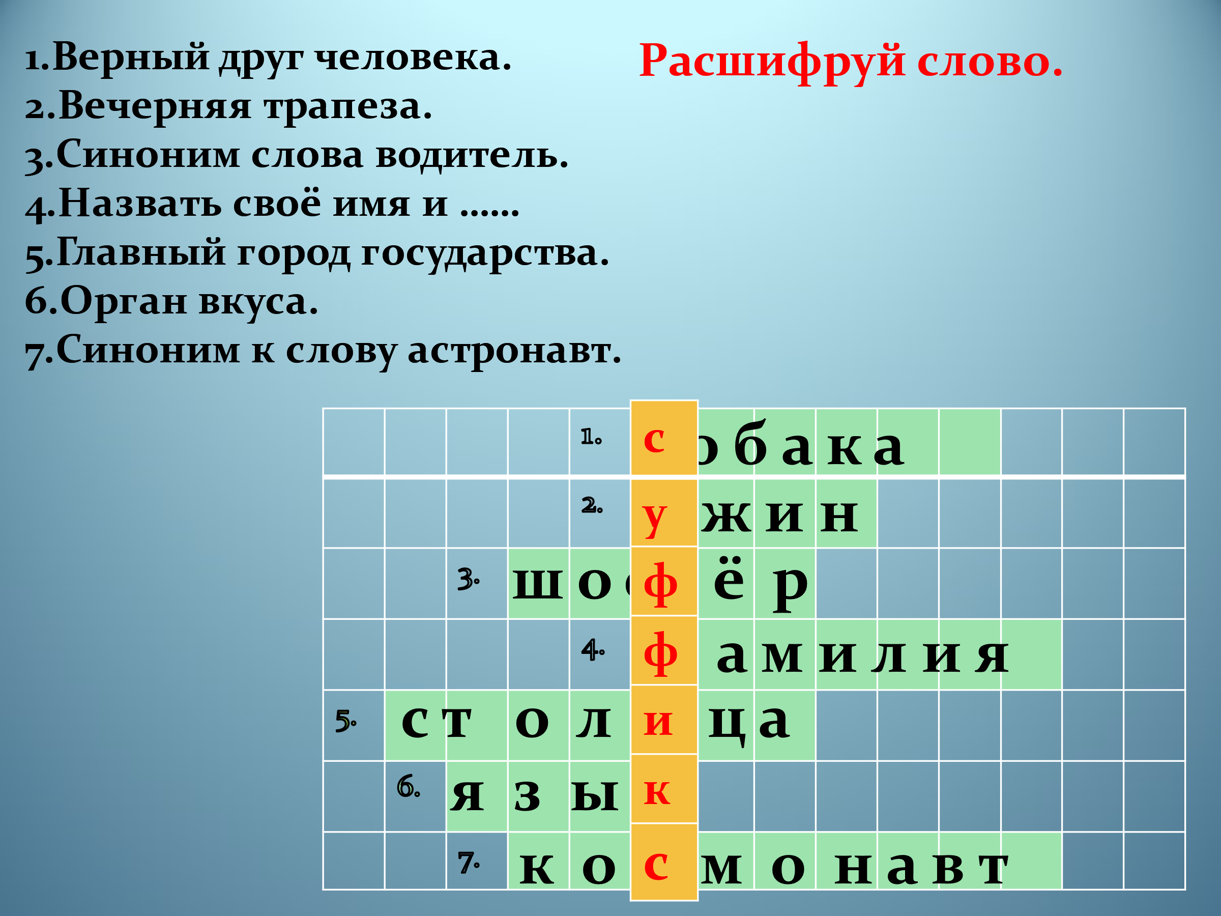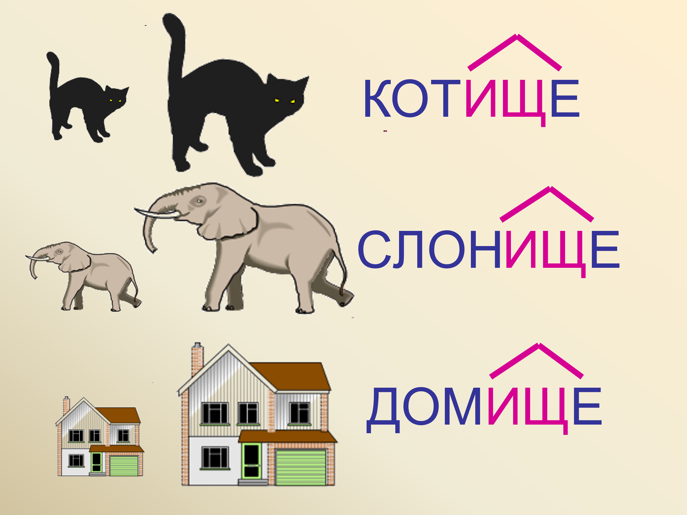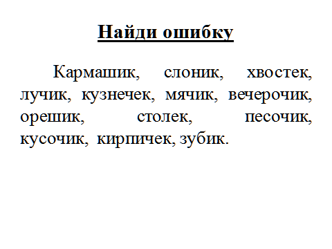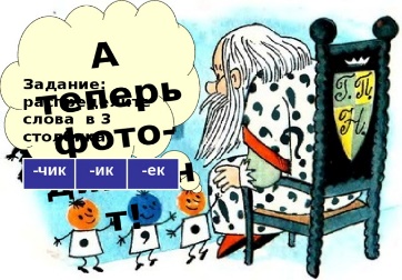 2. Актуализация знаний, мотивация Работа над облаком слов 3. Постановка учебной задачи 4. Решение учебной задачи | Воспроизведение знаний и способов действий необходимых и достаточных для открытия новых знаний: повторение правописания словарных слов, корзина идей, повторение ранее изученных суффиксов -онок, -ёнок. Создание ситуации успеха. Формирование и развитие ЦО к умению определять и формулировать проблему: еще не знакомы с правилом написания суффиксов–ик и -ек, познавательную цель: открытие способа гласной в суффиксах–ик или –ек на основе сравнения и умения применять данный способ алгоритма и тему для изучения: написание суффиксов –ек, -ик. (в совместной деятельности с учителем). Формирование и развитие ЦО к совместной познавательной деятельности по открытию нового способа деятельности (правила) Осмысление новой информации детьми. | Ребята, посмотрите пожалуйста на доску. Разгадайте кроссворд и запишите слова в тетрадь. 1.Верный друг человека. собака 2.Вечерняя трапеза. 3.Синоним слова водитель. 4.назвать своё имя и …….. 5.Главный город государства. 6.Орган вкуса. 7.Синоним к слову астронавт. Какое слово было зашифровано? СУФФИКС - Как вы думаете, о какой части слова пойдет сегодня речь на уроке? (О суффиксе.) - Что мы знаем о суффиксе? Дети делятся на группы. И на облаке пишут слова из правил связанных с суффиксом. Игра с суффиксами. - Ребята, я посмотрела через увеличительное стекло и увидела на картинках, что то не кот, а… - Не слон, а… -Не дом, а… -Каким способом образованы новые слова? - Какой суффикс помог образовать новые слова? - На что он указывает? Увеличение предмета - Пропишите слова, обратите внимание на соединение и выделите суффикс. -Я предлагаю вам заглянуть сейчас в сказку «В стране невыученных уроков», где главный герой Витя Перестукин попал в затруднительную ситуацию.(просмотр) Какое проблема встала перед Витей? (он не знает, как записать слова) – Он незнает правило ,Какое правило он не знает, когда надо писать - ик, а когда -ек. - Попробуйте сформулировать тему урока? - «Правописание суффиксов -ик, -ек» . - Чему мы будем учиться? - Мы будем учиться правильно писать слова с суффиксами –ик, -ек. Поставим цели, используя слова-помощники: -Узнаем….. (когда пишется суффикс –ек, -ик) -Научимся …(правильно писать слова с этими суффиксами) -Закрепим…(свои знания и умения) -Можем ли мы ему помочь? -Запишите эти слова. (Мы не знаем, как их записать) Ключик нет ключика Суффикс –ИК- сохраняет гласную при изменении формы слова: Замочек нет замочка В суффиксе –ЕК- при изменении формы слова гласная «убегает»: Давайте заглянем в сказку и посмотрим, как решал проблему мальчик. Витя Переступкин. - Давайте проверим, правы ли мы с вами. Как решил эту проблему Петя Переступкин Давайте проверим, правы ли мы с вами. Откройте учебники на с. 123. - Прочитаем правило. . Совпадают ли они? Значит, мы совершили верное открытие. Прослушайте сказку. Жили – были в сказочной школе суффиксы ик и ек. Суффикс -ик- был прилежным учеником, а его друг суффикс -ек- самым настоящим прогульщиком - вернее: К всегда оставался на месте, а Е умудрялся улизнуть. Один раз, когда Е опять убежал, учитель, суффикс -тель-, решил с того дня считать Е беглым гласным в суффиксе -ек-. И сейчас, когда мы начинаем изменять форму слова с суффиксом -ек-, гласный Е всегда выпадает, становится беглым Работа п