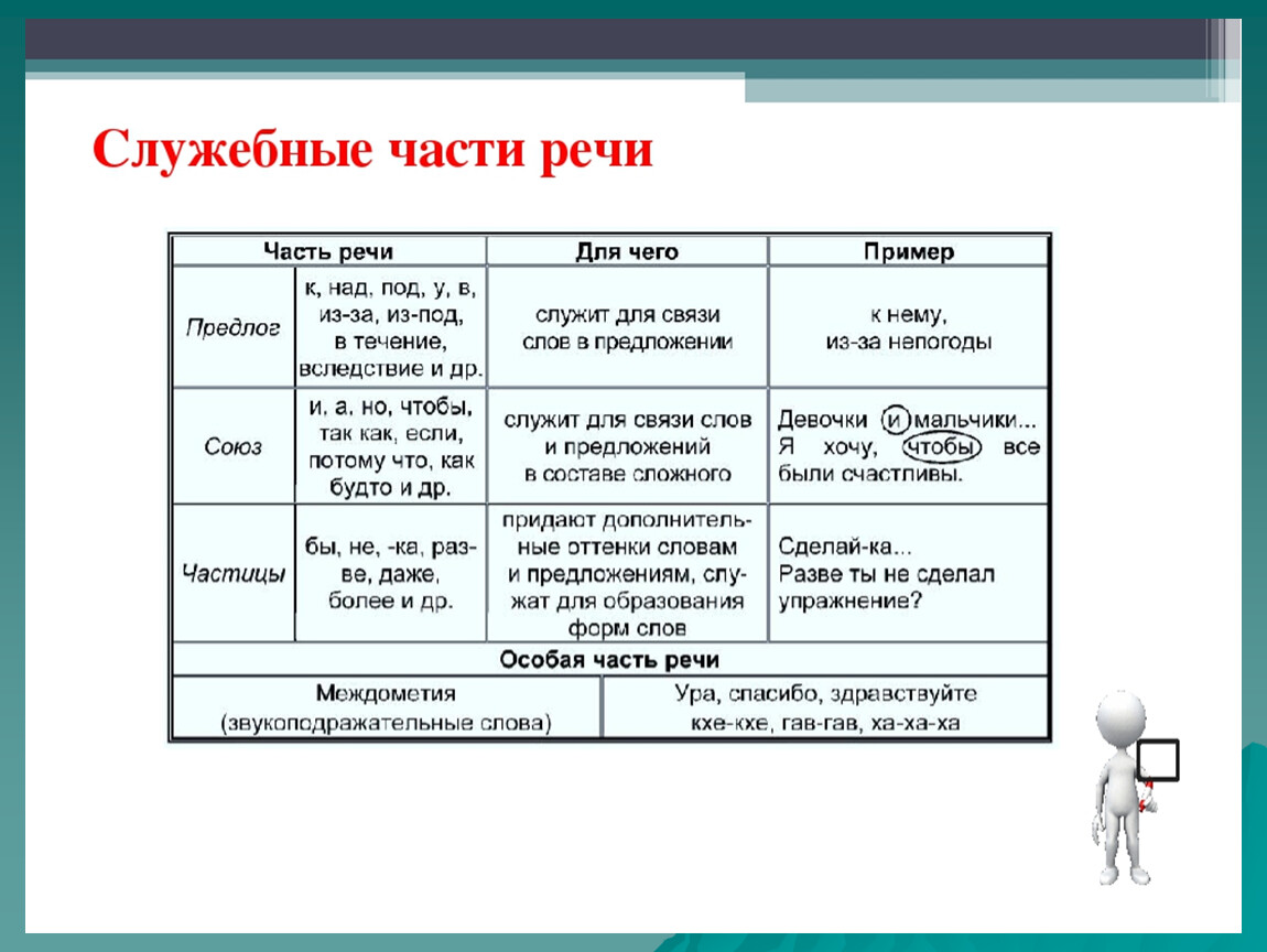 3. Выберите строку, в которой указаны служебные части речи: А) Местоимение, союз, предлог Б) Междометие, глагол, частица В) Предлог, союз, частица+ Г) Частица, союз, наречие