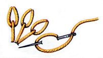 Прижать нить большим пальцем левой руки, ввести иголку в предыдущий прокол. Набрать на иголку 4-5 нитей. Иголку вывести на лицевую сторону ткани, так чтобы нитка оказалась под иголкой. Отпустить нитку из-под пальца и затянуть петлю.