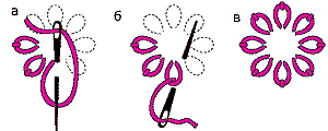 Такими петельками вышивают цветочки, травку, фрукты, бабочки, птицы и т. д.
