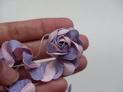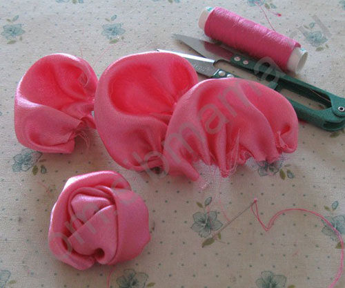 Начинаем делать лепестки розы с самых маленьких квадратиков. Складываем квадрат по диагонали и присбариваем через край (как помпончик). Серединку собираем сильнее. Действуем по правилу: чем больше лепесток, тем меньше сборок.