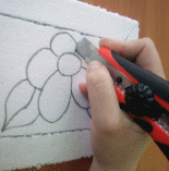 Начинать работу следует с основы. Как уже говорилось ранее, её можно изготовить самому или приобрести в магазине. На основу наносится изображение, делящее рисунок изделия на небольшие участки. Далее канцелярским ножом делаются прорези. (приложение 9, 10)
