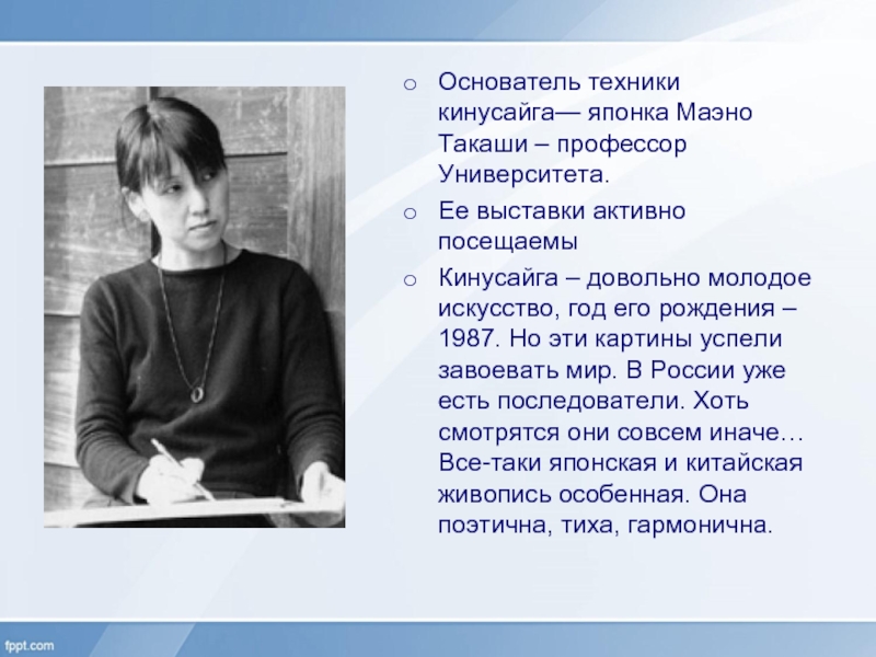 Но, что использует Маэно Такаши для создания своих творений? Не краски и тушь, а кусочки натурального шелка и деревянные дощечки (приложение 2). Картины Маэно Такаши многократно были представлены на выставках, а сама художница преподает искусство в Университете Нагоя и написала книгу по такой сложной и красивой технике. Её выставки активно посещаемы, книги быстро раскупаемы.