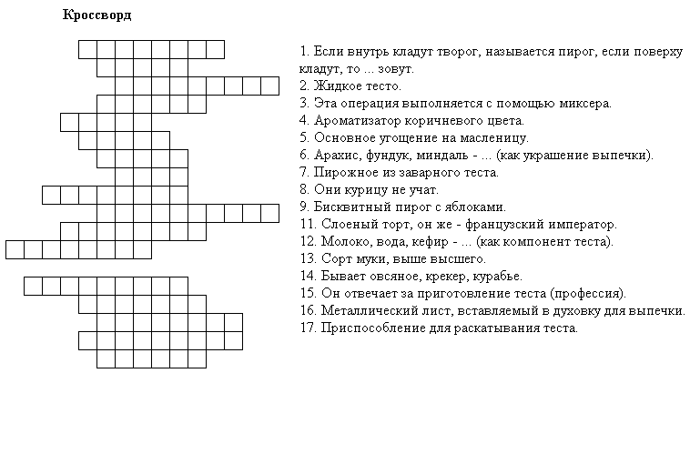 Командам предлагается составить кроссворд из слов, имеющих отношение к технологии приготовления блюд и изделий из теста, к оборудованию кухни.
