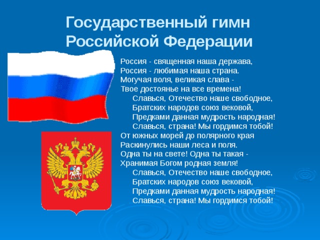 Мы с вами любим и гордимся нашей страной, а значит, должны гордиться ее символами. Давайте и мы выразим свое уважение к Российскому гимну и прослушаем его, как и положено, стоя, повернув голову в сторону Государственного флага.