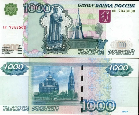 1000 рублей. На деньгах написан город – Ярославль. Ярославль — старинный город, его история начинается с XI века. Этот красивый город богат уникальными достопримечательности и по праву считается одним из самых красивых городов, входящих в состав Золотого Кольца. Ярославль сохранил богатое архитектурное наследие прошедших веков, за что в 2005 г. был внесен в список культурного наследия ЮНЕСКО. Город ни разу не переименовывался за всю историю своего существования.