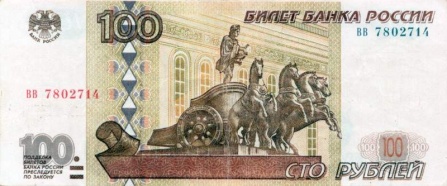 На деньгах написан город – Москва. На лицевой стороне 100 рублей изображена квадрига Аполлона, бога света, покровителя искусства, которая украшает портик здания Государственного академического Большого театра. А на оборотной стороне 100 рублевой купюры помещено изображение общего вида здания Государственного академического Большого театра.