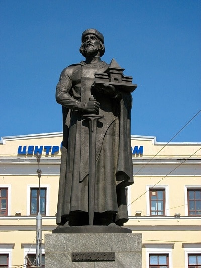 В руках у Ярослава макет города, который он мечтал возвести на берегу Волги, в другой — меч. Князь опустил орудие вниз, этот жест говорит о невоинственном характере Ярослава. На барельефе памятника запечатлена легенда основания города, связанная с поединком князя и медведя.
