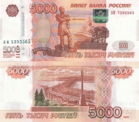 5000 рублей. На лицевой стороне изображен памятник генерал-губернатору Восточной Сибири Н. М. Муравьеву-Амурскому, который в конце 19 века был установлен в Хабаровске. Николай Муравьев был в Восточной Сибири генерал- губернатор, он и основал город Хабаровск. благодаря которому к России окончательно были присоединены эти земли. Еще заключил договор в середине 19 века, благодаря чему река Амур стала границей разделяющей Россию и КНДР. А на другой стороне купюры изображен мост через реку Амур в Хабаровске (2700м).
