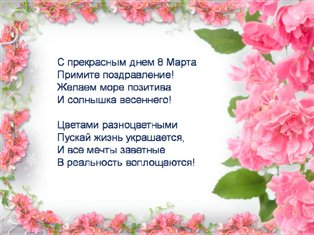 Пусть всегда женский день не кончается,Пусть поют в Вашу честь ручейки,Пусть солнышко Вам улыбается,А мужчины Вам дарят цветы.С первой капелью, с последней метелью,С праздником ранней весныВас поздравляем, сердечно желаемРадости, счастья, здоровья, любви!