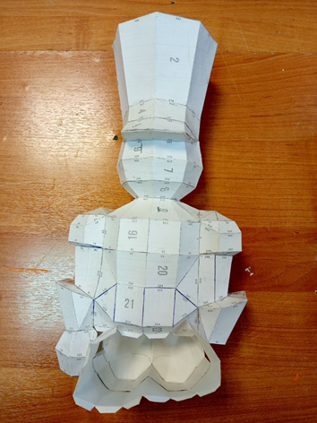 Согнутый край бумаги с внешней стороны обильно промазывается клеем. Цифры на «ушках» деталей — место для склейки, ищем к каждому числу такую же пару и соединяем их.