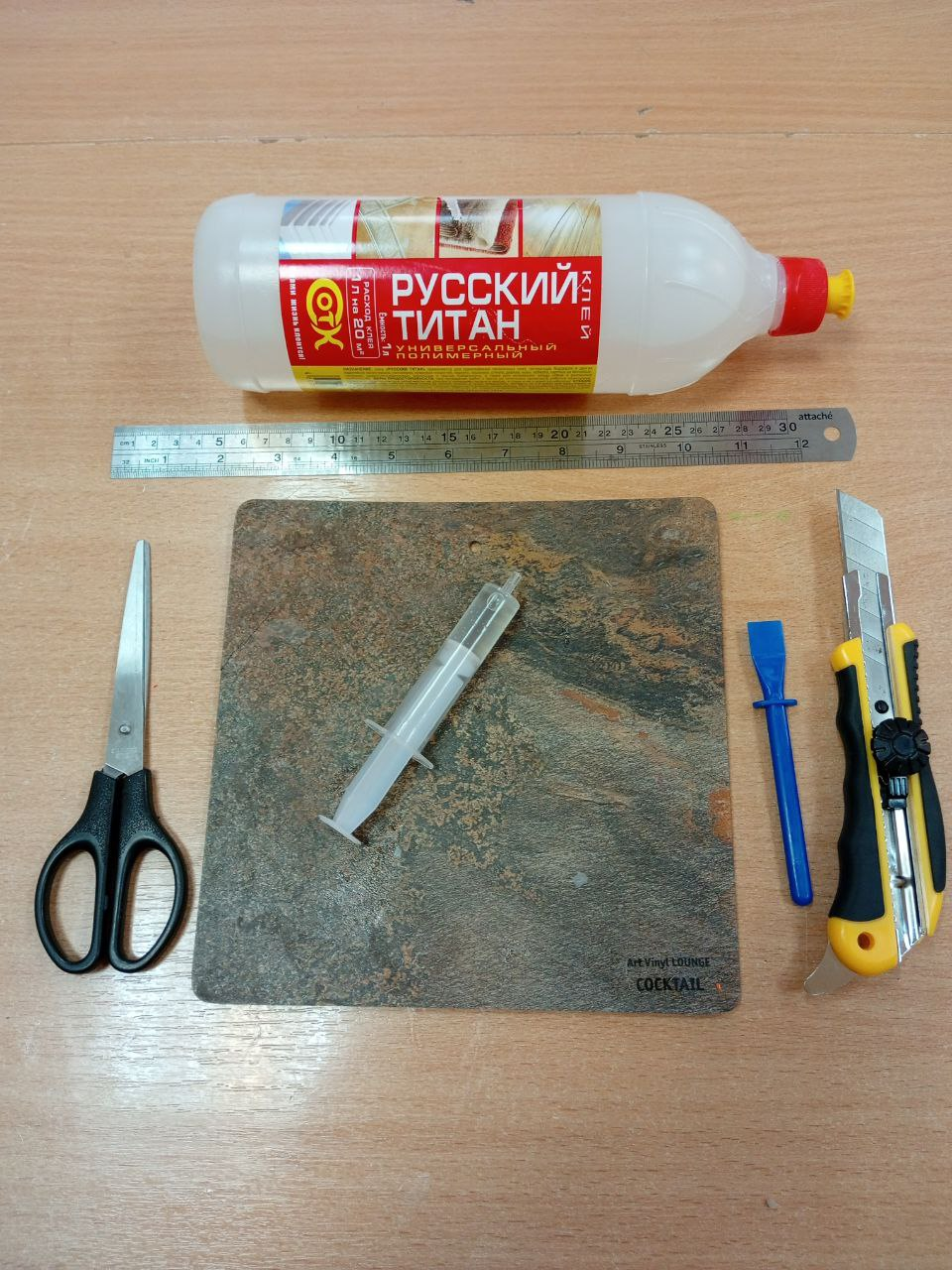 Чтобы не испортить рабочий стол, на поверхность необходимо положить кусок линолеума, фанеры или стекла.