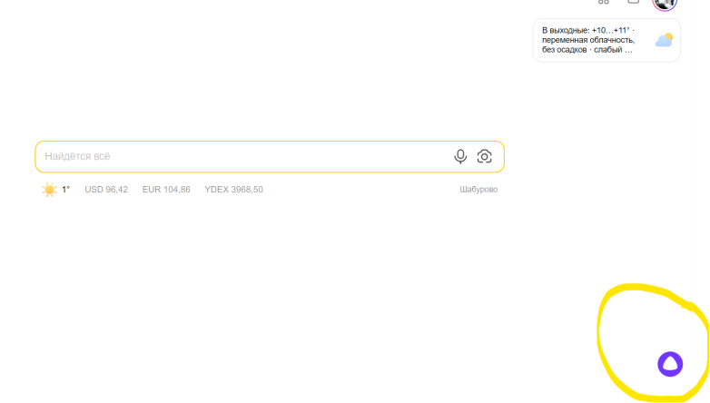 В правом нижнем появляется фиолетовый значок «Алисы»