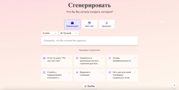 4. Выбираем «Презентацию», указываем количество слайдов 8 штук и язык «Русский», а в строке «Опишите, что Вы хотели бы сделать» пишем промт: презентация 7 класс по обществознанию на тему: Деньги и их функции