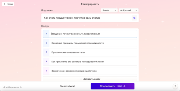 5. Кликаем на «Продолжить». AI автоматически создаёт названия, но их можно редактировать.