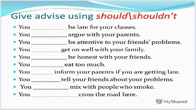 Should/shouldn’t употребляется для выражения совета, рекомендации.