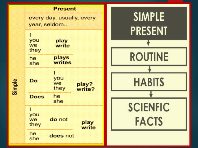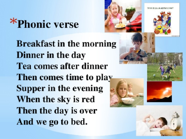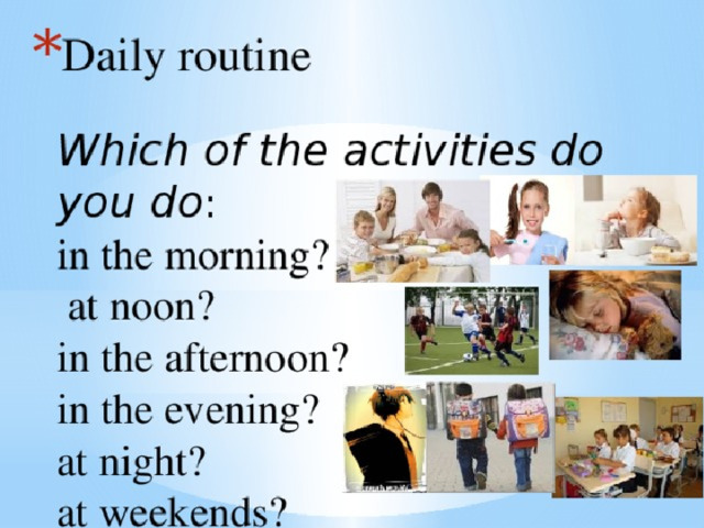 Vocabulary: listen to music brush teeth play sports go to bed go to school have breakfast have dinner have lessons at school