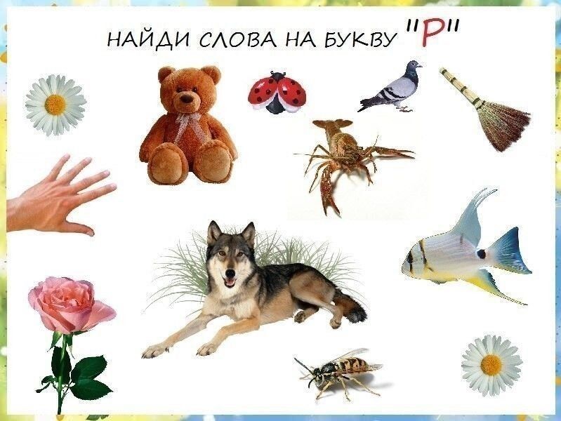 Картинки к игре «Найди звук». На черно-белом варианте назвать слова, в которых встречается звук [с], а на цветном варианте назвать слова, которые начинаются на звук [р].