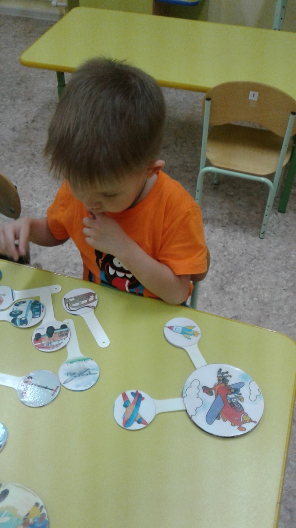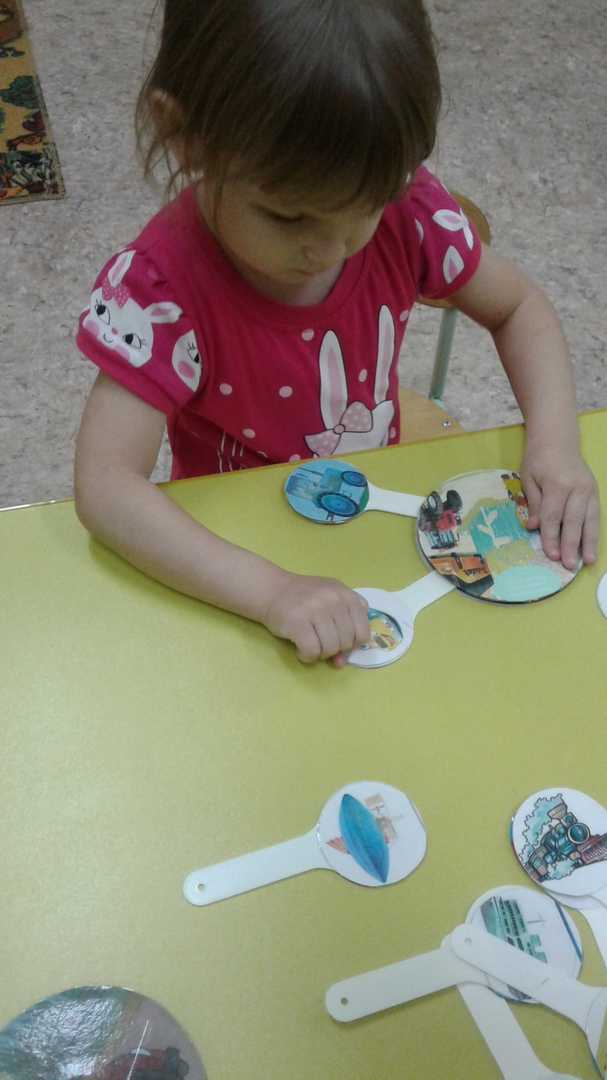 1.вариант - детям раздаются картинки с изображением неба, моря, железной дороги, дороги. (картинки наклеены на диски) . Ребенок выбирает и вставляет в пазы картинки, которые подходят к данному виду транспорта.