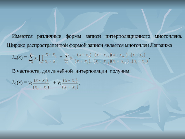 Разработан компьютерный метод пересчета коэффициентов полинома Лагранжа для его представления в виде канонического полинома степени n. Это простая формула для интерполяции данных эксперимента и легко дифференцируется. Может использоваться для интерполяции данных физического эксперимента. Для факультатива по физике, математике, информатике.