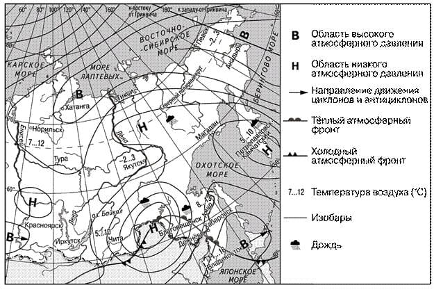 5. Выберите правильный ответ. Какой из перечисленных городов, показанных на карте, находится в зоне действия циклона?