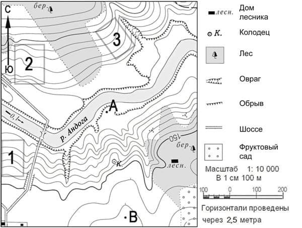 12. Фермер выбирает участок для закладки нового фруктового сада. Ему нужен участок, на котором весной рано сходит снег, а летом почва лучше всего прогревается солнцем. Он также должен иметь расположение, удобное для вывоза собранного урожая на консервный завод. Определите, какой из участков, обозначенных на карте цифрами 1, 2 и 3, больше всего отвечает указанным требованиям. Для обоснования Вашего ответа приведите два довода. Ответ запишите на бланке ответов № 2, сначала указав номер задания.