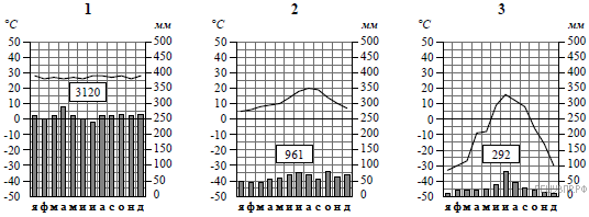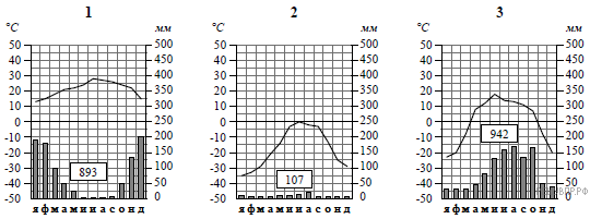 15. На карте мира пункты, для которых построены изображённые на рисунках климатограммы, обозначены цифрами синего цвета, соответствующими номерам климатограмм. Определите, какому климатическому поясу соответствует каждая климатограмма. Опишите по таблице климатограмму номер 1.
