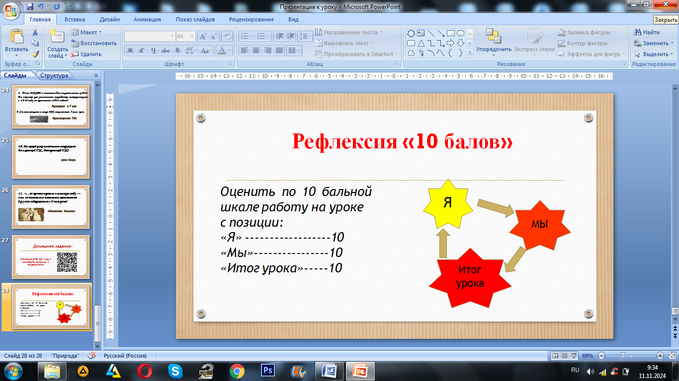V. Подведение итогов урока и рефлексия (рефлексия по методу «10 баллов») – (3 мин).