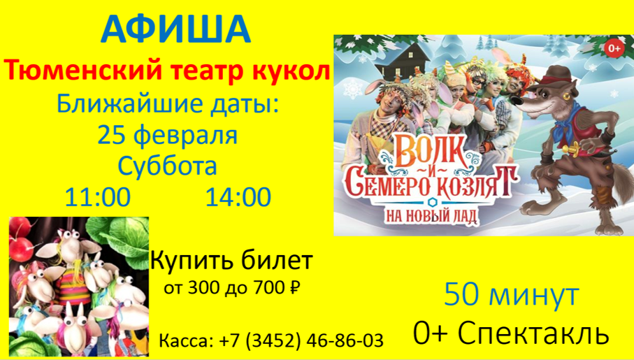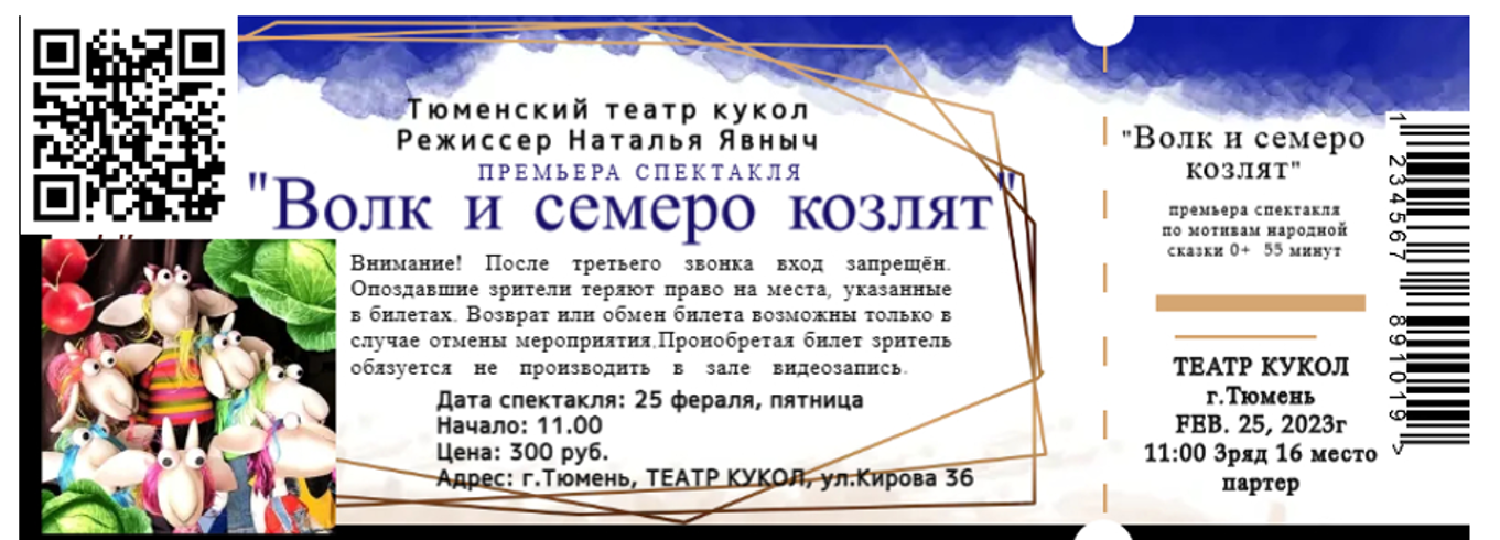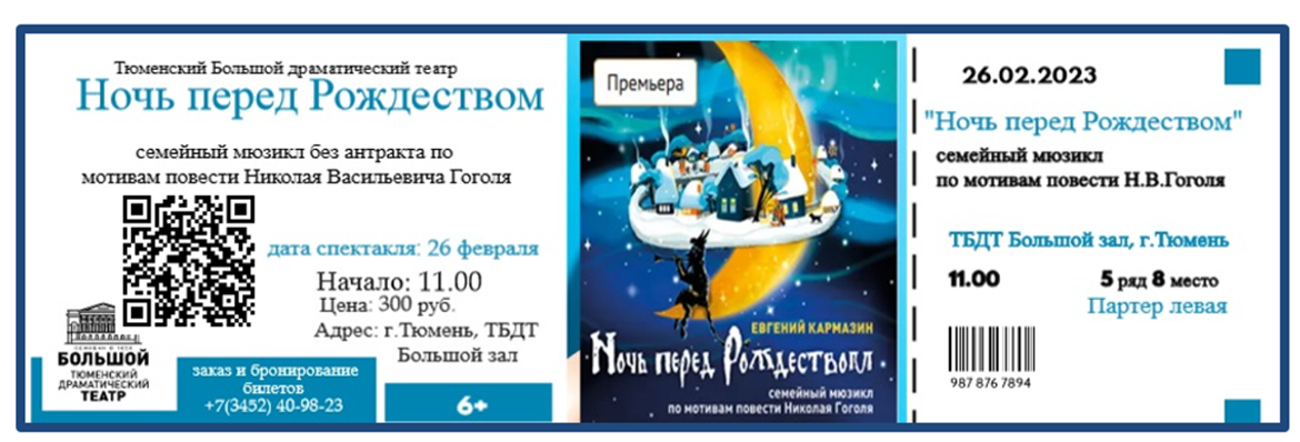 - Ребята, посмотрите на свой билет, можем ли мы что-то прочитать? Есть в билете текст? (Дети отвечают: «Да!») Прочитайте, куда вы идёте. (Первая группа получила билет в Кукольный театр г. Тюмень на спектакль «Волк и семеро козлят», вторая группа идёт 26 февраля в Большой драматический театр на мюзикл «Ночь перед Рождеством»).
