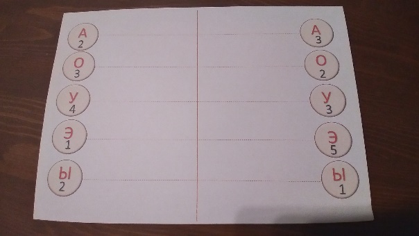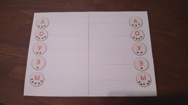 Материал: карточки с изображением пунктирных линий от центра к краю листа к кругам с изображением гласных букв и точек.