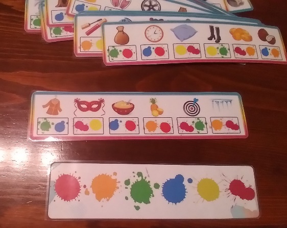 Материал: набор карточек с изображением шести картинок на автоматизируемый звук, под каждой картинкой две кляксы разного цвета и формы. Игровая карточка с шестью кляксами разного цвета и формы