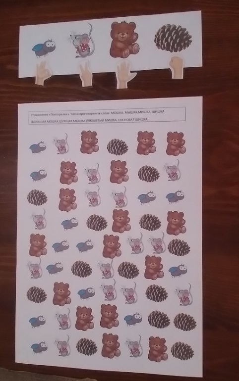 Перед ребенком выкладывается основная карточка с изображением: мышки, шишки, мошки, мишки над каждой картинкой определенная поза пальцев и карточка с повторяющимися изображениями. Ребенок называет картинку и одновременно показывает позу пальцев соответствующей этой картинке.
