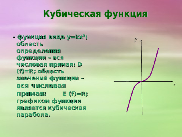 - функция видаy=kx³;область определения функции – вся числовая прямая:D(f)=R;область значений функции –вся числовая прямая:E(f)=R; графиком функции является кубическая парабола.