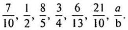 (Целое разделили на 10 равных частей и взяли 7 таких частей; целое раздели на b равных частей и взяли а таких частей.)