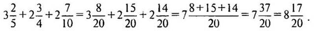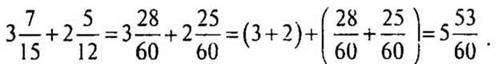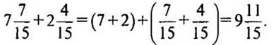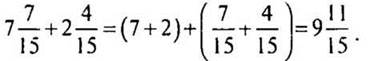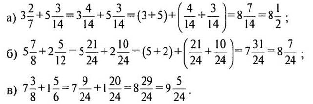 — Расскажите, как складываются смешанные числа, когда дробные части имеют одинаковые знаменатели. (Сначала складывают целые части, затем — дробные части.)