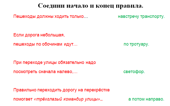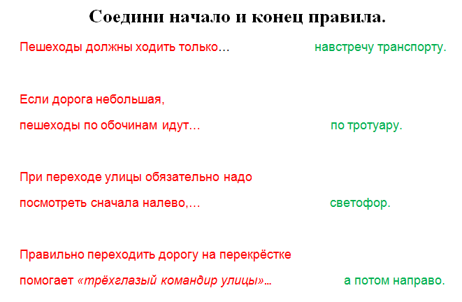| Основная часть | Создание проблемной ситуации -Послушайте рассказ про сказочного героя Буратино. – Буратино собрался в школу. Но чтобы по дороге до школы с ним ничего не случилось, давайте будем ему помогать. Как только вы услышите, что Буратино делает что-то неправильно, сразу хлопаете в ладоши, т. е. предупреждаете. -Ребята, вы помогли Буратино благополучно добраться до школы. А ведь могла случиться беда. Какие правила хотел нарушить сказочный герой? (Переходить улицу перед близко идущим транспортом, переходить улицу на красный свет светофора, идти по тротуару не по правой стороне и мешать встречным пешеходам) – Что бы вы посоветовали таким детям, как Буратино? (Изучать правила дорожного движения) - Когда человек учится читать, ему показывают буквы. Из букв он складывает слова, из слов - предложения. У дорожного языка тоже есть буквы - знаки. Их нужно складывать в слова. Один знак – одна дорожная буква означает целую фразу - дорожный сигнал. - Вы можете спросить: «А зачем мне знать эти знаки, я же не водитель?» Но ведь грамотный пешеход будет особенно внимателен там, где находится знак с указанием «Скользкая дорога». Будет осторожен, если впереди железнодорожный переход, или идут ремонтные работы. Ведь дорога говорит что-то, улица кричит о какой-то опасности, а пешеход «без языка» идет себе беспечно, потому что дорожного знака не понимает, сигнала на перекрестке не видит, об опасности на улице не слышит. Незнание дорожного языка опасно. Случается, за такую безграмотность пешеход расплачивается жизнью. - Случайных знаков не существует, все они придуманы для пользы дела. Тридцать лет назад было всего полсотни знаков, а сегодня больше ста. Почему? (Ответы детей). -А какие знаки встречаются чаще всего на вашем пути по дороге в школу? Физминутка “Светофор” У меня три круга: красный, жёлтый и зелёный. Что обозначает красный цвет? Желтый? Зелёный? (дети отвечают) - Вам мигает весело На прощанье светофор. И для вас горят они Светофоровы огни: Красный - стой! Жёлтый - жди! А зелёный - проходи! Беседа «Дорога в темное время суток» - Любая дорога в темное время суток становится сложнее и опаснее ведь значительная часть учебного года приходится именно на осенне-зимний сезон, когда рано темнеет и поздно светает. Замечено, что количество ДТП с наступлением сумерек возрастает. В этом нет ничего удивительного: в это время года ухудшается погода, чаще идут дожди. Еще вечером было сухо и ясно, а утром видимость ухудшается. Не полагайтесь на то, что водитель увидит вас,- будьте внимательными, предусмотрительными! Желательно позаботиться о том, чтобы в любую погоду и в темноте ваша фигура была бы заметна водителю. Этому могут помочь… «фликеры». - Когда вы были маленькими, сам маршрут в школу и его схему для вас составляли родители или другие взрослые. - Сегодня каждый школьник должен знать, что улица очень опасна для того, кто не умеет правильно ходить по ней. -Но тот, кто твёрдо знает и точно выполняет строгие правила дорожного движения, может не опасаться самой быстрой машины. Давайте повторим эти правила. . - Давайте вспомним ваш путь на карте (каждый учащийся имеет возможность по карте показать свой путь в школу). - Чтобы найти безопасный путь в школу, как вы думаете что для этого надо знать? -(Правильно, надо вовремя выходить из дома, хорошо ориентироваться на дороге